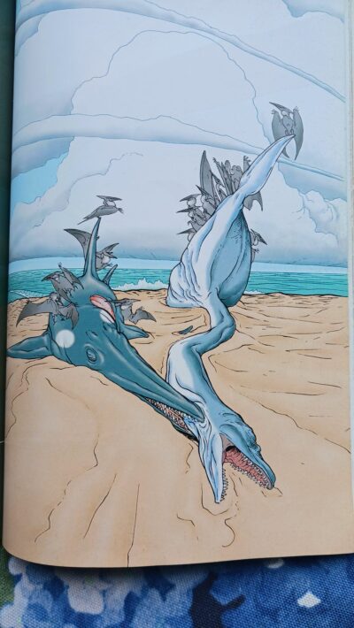 The art of the actual story is perfect for setting the mood of the scene, or overall tone. There is violence, as after all the reptiles we follow are mostly meat eaters and sometimes animals have accidents, but it is not gratuitously done. What we get is just showing that the reptiles have to eat and have to defend themselves. What is there is nothing we would not see in a nature show of today, and since it is drawn and not realistic, we are taken out of the immediate intensity. My two favorite scenes are first, where the flying reptile is slicing into the clouds. Had this been a movie, as one introduction says it could be, I would expect you to see it coming out the other side, with little to no cloud disturbance (or if it had been more science fiction/fantasy you would enter another world on the other side). The second one is where two sea creatures are dead on the beach with their telling, but seemingly small details, showing. Such as the seemingly aggressor still has its prey in its mouth (the other creature) and both are at least shark to whale sized; as well as one of its fins partly covered by sand peeking out after the body, disappearing and then showing again. Plus even the waves rolling and crashing in the backdrop are causally there, but setting the scene.