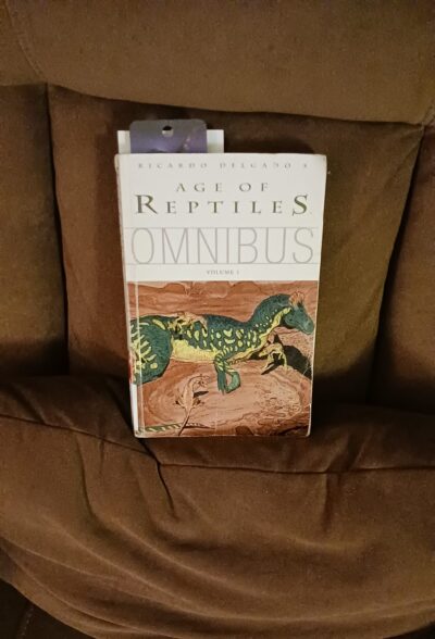 Age of Reptiles Omnibus, Volume 1 by Ricardo Delgado is an expressive and talkative wordless graphic novel. However, things were a smidgen repetitive by the final section/chapter as we follow several different species, but all have similar needs and actions. I recommend not reading any of the introductions until after finishing if you are an adult (and since I do not see kids reading them I do not think this will be an issue) as they can, even subconsciously, tell you how you will and/or should feel about things. I skimmed most of the extras and did not read the essays included at the end. These things could be important if you want to see the “entire picture” and process of Delgado, but they are not necessarily needed if you are just looking for a casual read. Though the bonus cover art and sketchbook should be looked at as that process of change and the covers of the issues collected in this edition are just neat.