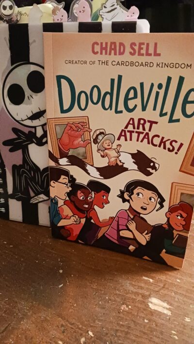 Doodlesville #2: Art Attacks!: (A Graphic Novel) by Chad Sell might not be as strong as the first book in the Doodlesville series, but it is still an interesting story about growing up, self esteem and teamwork. It would be best to read both volumes back-to-back (so if you have read volume one it just means you need to read it again). Chad Sell has a style that you can see in this series and their other series, The Cardboard Kingdom. Which is lighthearted, humorous and with a message. Things might not always flow as you want them too, or the story arcs in the direction you wanted or was thinking, but it goes the way it is needed. Doodlesville and The Cardboard Kingdom deal with diverse characters and with the exceptions, things are presented as “normal” and are naturally dealt with.