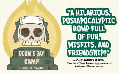 I honestly was surprised at how much I liked the graphic novel, Doom’s Day Camp by Joshua Hauke. At first, I felt it was just going to be “dumb humor” or “not for everyone offbeat and off color humor” but most of it turned out to be pretty classy. (Okay! Okay! There is one earth shattering f**t, but it did save the day! And frankly, f**ts are funny if they happen to someone else.)The ideas, of course, have been done before (a nerd/uncool kid does really well, saves the day a few times, screws up a few times (usually those two things are happening in reverse) and has some out in left field ideas that are actually good), but the twist is this time the “normal” one is the “weird” one makes it a bit fresh. There is a depth to it as well, that is not lost with the surface humor and fun. The world might have ended, but that is just the beginning of things.