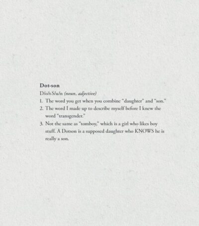 Grayson Lee White is a young teen by the end of his memoir, Dotson: My Journey Growing Up Transgender. They started their story at the end (around age 12) but flashback to show us the journey they took. This is an interesting memoir of Grayson’s transition that is told in their own voice. His journey is relatable and understandable, because what he was going through is something we all can feel: such as he felt he didn’t fit in, things were wrong with his body, and most importantly he just wanted to be free to be himself. And when he finally realized that he was a Dotson (which was what he called himself (a daughter and son) before he had the language to really express their feelings) that’s when things opened up.