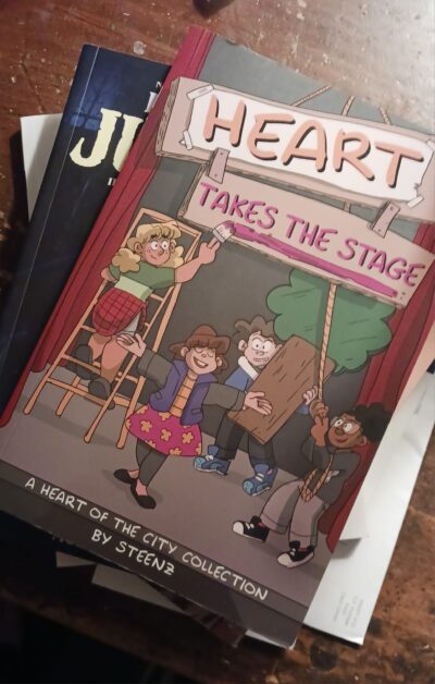 And then we have Heart Takes the Stage: A Heart of the City Collection (Volume 1) by Steenz. This is the graphic novel Drama meets Diary of a Wimpy Kid with something else that I can’t put my finger on. The comic strip feeling allows each story to be its own arc, but they also connect in the long run. Sometimes the flow is a smidgen off, but you are able to piece things together. Some of the humor is not for everyone, such as the Star Trek fans’ love of Wiliam Shatner and the joke about the single mom makes this maybe not for all ages. There is one contemporary event that is handled very interestingly (one girl tries to come out) but only one other character picks up on it, and it is not the main character, Heart (who is probably the worst friend/person I have read about in awhile). And that’s the rub. The character of Heart is really not a nice person and I am not sure why the other characters like her/are her friends. This did not work for me, but I think most kids might get a kick out of it.