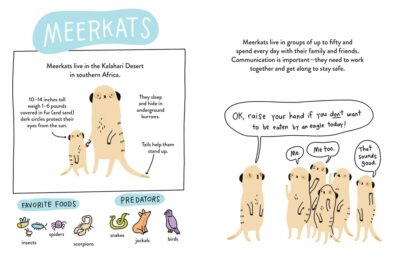 How Do Meerkats Order Pizza? I think they would call up their favorite joint and say, “A large cheese and scorpion pie please. And hold the eagle feathers.” (Or something like that.) That is of course, if they ate pizza. They do eat scorpions though, and in How Do Meerkats Order Pizza?: Wild Facts about Animals and the Scientists Who Study Them we learn some amazing and fantastic facts about animals. Some of which we might not usually see in a book, so that is very cool. And even if you do know a little about them (like meerkats) you just might learn something new. And we