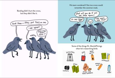 also learn a little about the scientists who are studying them. And not just that, some of the equipment, like a submersible that only holds three people, who aren’t wearing shoes (so I really hope they all put on their foot deodorants!) Or how crows recognize faces, and are scared of cavemen face-mask (because they did something that upset them) and not the Dick Chaney masks (and you are telling me they are smart?) This information is fun. We meet scientists that started out as kids, and we see how they took their love of animals (sometimes not the ones they study now) and made careers out of it. We see how spoons can be used to scoop things that you don’t want on your spoon and some far out goodies.