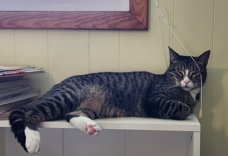 I’ve fully embraced being a crazy cat lady. I’ve learned quickly that I need to leave a few shelves empty in a few rooms because cats will cat wherever they want. I don’t have any pics of my kitties in bookshelves yet, because they’re too fast. I’m sure I’ll get some into my upcoming reviews thought!