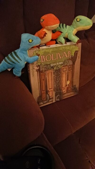 Bolivar by Sean Rubin is a cute book about what we see and do not see, and how that affects us and those around us. Humorous moments will have you laughing, but also you will also think. My library version (a little beat up and I assumed well read) was an oversized “art looking” or child coffee table book (if children had coffee tables). The oversized format might turn off some of the slightly older readers (the book is for ages 8 up to 10 or 11). However, it is a fun read for the under 10 crowd or the to be read to crowd. It is on the longer side, so it might take some time to be read-aloud, but worth the time. Especially since you need to take your time a little as though it reads fast several things are going on at once.