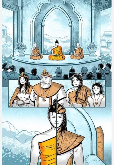 The artwork is the thing that keeps things following by showing the world of the time. When The Enlightened one is a child, things are straight forward, but when he finds enlightenment things are more flowery and moving, then afterwards is straightforward. The colors are minimal, but the actual image details are both simple, but fill out the page.