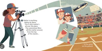 Catherine Ciocchi, Burgen Thorne and Chantelle Thorne made a book that brings the theme of Matter into a way that is more accessible than a boring “just the facts” type of book. The use of baseball takes something we are mostly familiar with, and uses it to describe the concept of Matter. What it is, how it works, and so forth. Rhyming text that mostly hustles along the page, we see how solid, liquid or gas elements make up everything from ballparks to us. The text is complemented by mostly easy to understand and view images. The colors and imagery are not overwhelming, nor are they muted. They are sweet, and innocent, meant to look as if you could grab them off the page like a preschool-wobble toy. But not cartoon or childish.