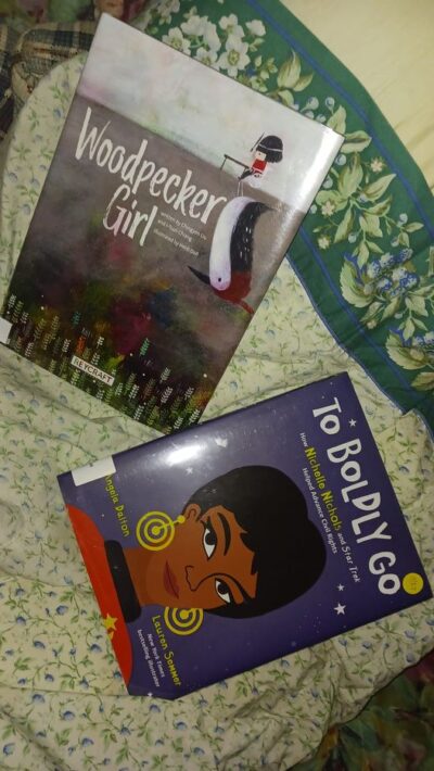 A while back I found a book from Reycraft Books that (at the time) was a future publication. And since I enjoyed it and the person I was dealing with was so delightful to work with (I had asked for a reader copy and we conversed via email for a bit), I have found myself wanting to read more Reycraft Books. I found the title Woodpecker Girl in my research. Locating an online sample of the book, I realized that was not enough. I said, Pretty Please Library Loan Please, to my local library and they found me a copy. The results of my reading showed that this book has a lot of layers, and yet, is also very simple.I have now read the book three times (sadly I can only review once). The first time, I read the text and enjoyed the illustrations. I knew a little from my earlier research that the art was based on the real Woodpecker Girl’s work (the person the book is based on is a woman who has cerebral palsy and her art teacher found a unique way to help her paint), but also was Heidi Doll’s unique style. When I then read it a second time I focused on the illustrations, because when I read the author and illustrator biographies, I learned that Doll had put two things on each page. There is a “game” for you to find a not-so-hidden-item and a somewhat hidden gem within the detailed pages. (SPOILER) There is a woodpecker and rabbit on each page. The woodpecker represents the freedom of Yipei Huang, the person the book is based on, and the rabbit is Doll as a spirit protector of sorts to the subject. And of course, I had seen the woodpecker, but not the rabbit and I had to find the two animals (hence reading two). It is not easy to find the rabbit, especially if you’re reading online. Which was my third reading. I found a video of someone reading the story. However, since I was at work, I did not think I should listen to it (I am saving the link for “Read Number Four”) and read the captions. I was also not sure if I had speakers yet or not (I have an odd computer) so subtitles it was. There was a bit more than just a reading/listening video, such as there was a few minutes with Yipei Huang themselves.