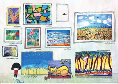 In the afterwards of the co-writers, I-Tsun Chiang and Chingyen Liu (and in the video) we get more background material as the story itself is poetic and romanticizing (but keeping it realistic). The life of the person in the wheelchair of the page is the narrator and she tells us the story of her frustrations with her body’s limitations, her lack of communication, her anger at not being included or having friends, even the sadness of not being able to cuddle her puppy. The art is lofty and airy as well. They fit each other by complementing each other. When we learn that the person of the story “dabs” at the page, we see that style reflected on the page. We will learn that it was not until this person was almost out of school were they able to paint. We see the freedom painting gives them, and the talent they found. You can see several actual paintings within the story and several examples are at the end. It is a fully loaded book.