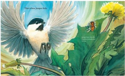 When I saw Jumper: A Day in the Life of a Backyard Jumping Spider, My first thought was, “Oh a spider.” My second, “OH! A jumping spider?” and finally, “How can I freak out my sister with this book?” (As she does not like spiders. And I’m that kind of big sister!) This book by Jessica Lanan, is about a spider. Not the species, or all spiders, but one particular spider and the things that she does and happens to her throughout the day. She tries to catch prey, she hides from predators, she hears and feels things with her elbows, the hairs on her body and so much more. It is informative, without being “just the facts.” The illustrations of Lanan are both realistic, but have a bit of a dreamy look to them. I am assuming that they are some type of watercolors. This is reflected by the colors and style of the images. The details are busy, as you are in the garden and seeing all the things of it. However, the best (and worst) image is when you see the perspective of Jumper herself. Spider view can make humans go “Phew!” The underwater effect is not for the weak of the tummy! And while it is realistic with what and how spiders eat, it is not gratuitous.