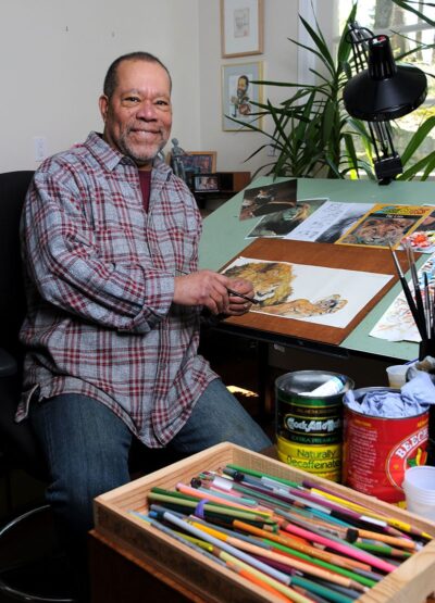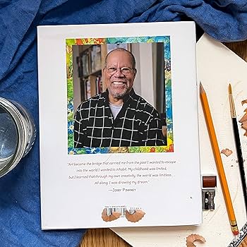 The thing I enjoyed most about this book is that it is honest, but hopeful. We see the racism of the time, but we see how Jerry didn’t’ let that get him down. But how it did shape his thoughts. We probably don’t see the worst of it, but we do see the doubts he has, the hopes and dreams, and the relationship with his family, friends and the neighborhood. We see how he became who he was meant to be. And all the while, dealing with the hardships such as dyslexia, racism, and interesting relationships with his father, mother and siblings. When he has some lucky encounters, and important ways to use drawing to help him grow, his determination is what it took to make the artist. The inspiration of his journey is relatable to all.