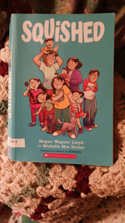 And then we have Squished: A Graphic Novel by Megan Wagner Lloyd and Michelle Mee Nutter (illustrations). It is a cute story about a huge family (total 9, with all but two not in double digits) and the coming of age of the oldest girl. The dynamics of family and friends unfold in a “happy format” and is good for younger readers. It is “grandparent friendly” (meaning nothing really bad happens). Cute artwork keeps things light due to minimalism with details. It is mostly text driven, with some illustrative support.. If you read a lot of coming of age stories, nothing is new here, but still entertaining and representative of diverse characters. There is potential for sequels with the same narrator, Avery, on a new adventure, but also I would like to see oldest child, Theo, or the next girl after Avery. But I wouldn’t want to go to the preschoolers or the babies.