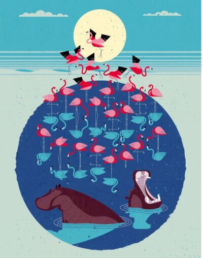 We travel around the continents learning about the different animals that are out there. The unusual way of presenting them via the illustrations, make it fresh and unique. This is not the usual “this animal is a koala and it lives in Australia” and now you can go to sleep because you’ve read and/or heard this before. There is UMPH! to things. And the animals are mixed with some you know, some somewhat familiar and some that will be new.