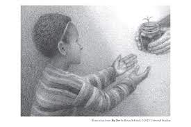 While I did not completely love the grainy illustrations of Big Tree by Brian Selznick, I understand the reason for them and appreciate them. And there were several that were more fleshed out, but they felt few and far between. The story is a mature environmental tale with spiritual elements that is told by two seeds from a seed pod from Mama Sycamore. It does not sound like it makes sense, but it does, even if sometimes the flow of the story felt to be not as even as I would have liked. Afterall, we must see the world through the seed’s understanding of the world around them, or really more accurately, lack thereof. The two characters are siblings, Merwin and Louise. Merwin has always cared for his sister, via their mothers orders. He is the one that tells Louise what the mountains, sky and stars look like. And he talks about the Giants. Louise is more of a dreamer (literally and figuratively), as she spent her early life in the center of the pod, with no way to see anything. She is the one that feels and eventually hears the Voice. When they are knocked off the tree, they fly off, holding onto each other and have adventures that realistically a seed wouldn’t survive, but they do. (However, the afterwards does say that Selznick did research things, so perhaps this is possible, yet, I found it to be poetic and what the author wanted, though some events could happen, such as traveling on an animal’s fur, or blowing on the wind). The journey is not, of course, easy, but the two learn of things.