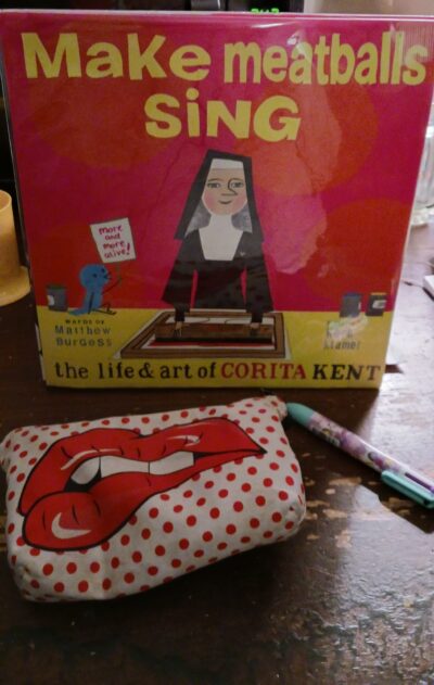 Okay, I will also say that Make Meatballs Sing: The Life and Art of Corita Kent has really cool illustrations that are inspired by Kent and the style of the illustrators mix-media format. There are colors, shapes and all the ins and outs of what you would expect from Kent’s work and life. They are unqiueq detailed and there are hidden pieces of fun (the blue bird and the hot box of popcorn) are two that hide (sometimes in plain sight) on the page.