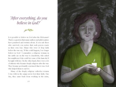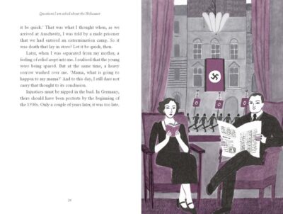 classroom discussion, for essays, and more. There are also facts about the identity of Jewish peoples, history of the people, as well as the larger picture context. I usually skip these kinds of extras, but the Jewish identity section captured my interest and I went back and read them. It was not enough that some of the facts that were already presented in the answers was actually new to me, this had to add to things! There are also illustrations by Laila Ekboir. I do not wish to make them seem like an afterthought, as they are anything but, yet it is hard to get everything I want in! These are sometimes on the page with text, or take up pages on their own. They are simple, not overly detailed and actually have a somewhat positive feeling to them. Even if you see things like an SS soldier, or a swastika. They are colorful, and while not “in depth” they are telling. And while I would not have them as art on my wall, they are well done and artistic.