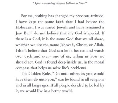 The setup of this book are the questions Fried has been asked over the years, such as Why did Hitler hate the Jews? What was the worst thing that happened to her? What was her life before the war? Do you still hate Germans? Was there anything good?, and edited into short (a few pages each) answers. And while some seem odd (Were there nice Nazis?) they are not flippant nor are her answers quick or dismissive. Things are detailed, but not bogged down. They are emotional, straightforward, and can make you think. Some of the experiences that Fried encountered, we have heard before, and many were unique to her. The timeline at the end allows for placement of when things were happening to her and also how quickly things were happening. As she said, you got used to things easily, even injustices, but the one thing the Holocaust taught her was to never get used to injustice.