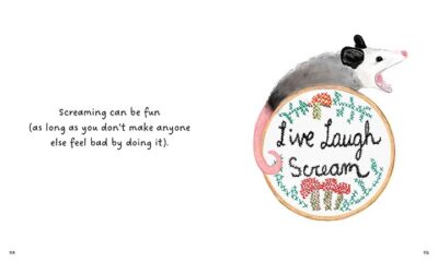 Are you having a bad day? Had a bad year? Then get When in Doubt, Play Dead : Life Advice from an Unexpected Source by Ally Burguieres. This book has different sections and tells you WWAPD (What Would A Possum Do). And what would they do? Play dead. Let go. Sleep with whomever they want to. They don’t care what is in your pouch (unless it is snacks, then maybe share). Check on your friends. Know that you are never too large, little, old or young to hold hands (or tails). And they know the right time to smile and scream. Each section is funny, but practical and there are some of the most A-DORRRR-ABLE illustrations accompanying this text. This is just a fantastic book that is for anyone who likes cute and funny things.
