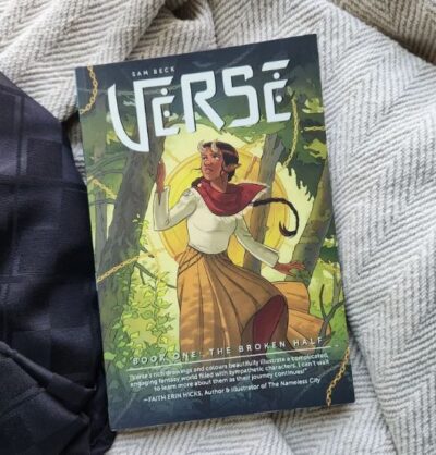 If you are looking for a typical fantasy novel with fantasy adventure and situations, Verse Book 1: The Broken Half by Sam Beck is the graphic novel series you are looking for. However, there is some violence, but mostly it is there to move the story along, to show such things as characters’ personalities and such, and not for shock. Still it is for mature audiences/older readers. There are lovely illustrations that are busy, and can be physically dark in colors and shadows. Of course, there is the use of light and brighter colors to set the mood, but you feel as if you are in the forests of old Europe. However, our main girl is of color (a flashback/dream makes it look as if she is from India or middle eastern descent). The cover is giving off medieval, historical vibes (and though the cover looks like Saga by Brian K. Vaughan, that is the only similarity). The world is magic, peasants, thieves and monsters that are a combination of several types, such as zombies, tentacles, sharp teeth, variety of clothed or unclothed, and some child-like and/or female presenting, and some are male presenting. It is a familiar story, with a few new twists and turns.