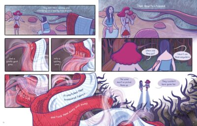 Though currently available, I read this via an online reader copy. I am hoping to find a finished copy as I think part of the appeal could be lost or gained because of the size of the actual book. I think ages eight to 12 would be okay with things, but as always know your reader. What drew me to this book was the brilliant cover. The colors are bold, colorful and fit the mood of the time. The shadows and light are used to show the deep, dark woods the sisters find themselves in, red to show anger or passion; with blues and yellows pepping the first story by capturing the ocean or the hat of the fisherwoman. The original tale is included at the end of the book along with an afterwards by the author showing their inspiration for doing feminist stories and why they chose these in particular.