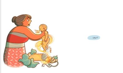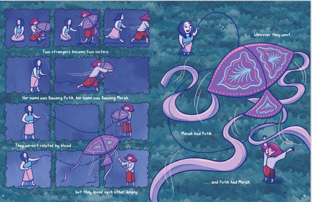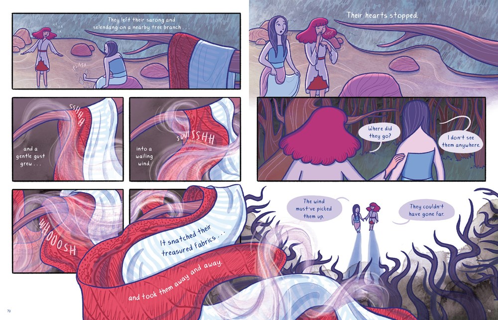 Three gorgeously illustrated, feminist-twist folktales, myths, stories are included in Stories of the Islands by Clar Angkasa (Clar pronounced like Clark without the k) based their stories on the ones of their childhood, adding what might not seem at first “girl power” but will become that, to each one. There are some mature themes (the giant wants to eat the girl, the father is abusive to his daughters, a village thinks that a woman who is single with no children is odd and tells her so), but overall well handled and most ages would be okay with. However, sensitive readers or very young might not be the best audience.