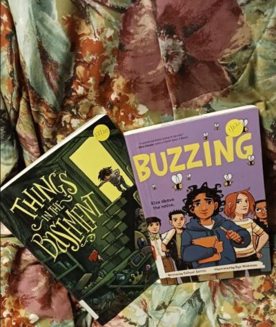 Samuel Sattin’s book is a bit idealistic, but this is what makes it work. It is relatable, sweet, and gives us a “Happily Ever After” without sugar coating it. And Rye Hickman’s illustrations know how to add details and the use of color to really move the story along. The art is the stronger part of things for me. The use of colors shows the “bad moments” or the “good moments” that Isaac deals with. They show how his mind can be confused or called, and this happens with details as well. Such as if things are going out of control, the Bees/Thoughts can overflow and fill the page, blocking everything and anything out. And when they are with their new classmates/friends (or later a second gamer group) how bright, colorful, calming things are.