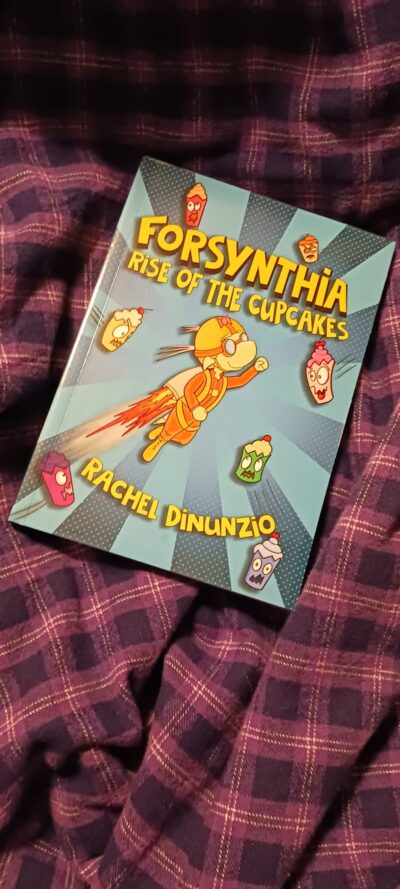 Working in an independent bookstore has a lot of perks. One is that you get emails telling you BOOK X is coming out! Request a reader’s copy today! And when I got an email telling me that Forsynthia V01: Rise of the Cupcakes by Rachel DiNunzio was available I emailed the rep and asked if they had a finished copy. And they happily sent me one. Therefore, I read via a physical reader’s copy and glad I did. An online version would not have had the same “fun” to it.