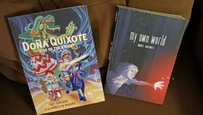 The artwork is simple, detailing what is needed and when it is needed. This simplistic nature is not negative, allowing you to focus on the story, but also see how the surrounding things are important. Practically the entire time the brother is in the hospital with his unnamed (but assumed cancer) illness is wordless and little clues are important. There are pages with little to nothing on it, but our main character or one small object. Colors are important as the “rose/berry/red colored world” is to show you imagination vs reality. The color blue is also important, as is the lack of color or lack of anything but a black, blank page. The text is minimal, mostly there to move something along that images can’t. Sometimes there is a word or two or phrase on a page and nothing else.