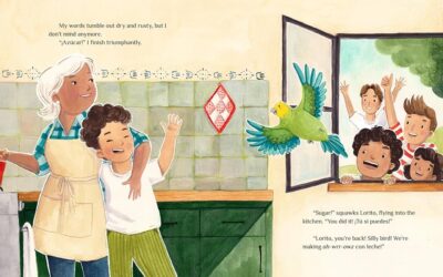 I have read several books about “not speaking language X” and the troubles it causes with family and/or friends. This time, in Squawk of Spanish, we have a young boy, Max, who cannot speak Spanish well (he has trouble with his rolling Rs), but that’s okay, his grandmother’s parrot does! So when the two (abuela and grandson) bake together, between the three of them, they have their routine down and get the job done. But when the parrot has decided to not to come home after a little jaunt one day, how can the two learn how to communicate to get the food ready for them and the cousins?