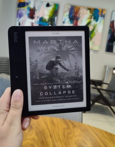System Collapse is the seventh book in the series and it directly follows the events of Network Effect—so the following review is going to be a bit spoiler-y by nature. When we were last with Muderbot and company, ART (my beloved) and the crew had been rescued from a colony planet where they were dealing with humans that had been exposed to some kind of alien remnant contamination. The ordeal was harrowing, to say the least, and by the time we check in with Muderbot at the start of System Collapse, its not doing ok. Something is affecting it rather badly, but we don’t know what it is, because it’s [redacted]. Muderbot has literally redacted it from the diaries. And it seems it would love to do that from its mind as well.