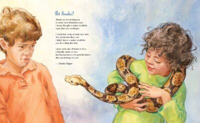 Finally, but not least, Bless Our Pets : Poems of Gratitude for Our Animal Friends edited (and a few written by) Lee Bennett Hopkins and Lita Judge on the illustrations. The poems are spiritual, as each author tells a story/poem about their pet. From the scared kitten to the old tired doggie. There are snakes, gerbils and hamsters (not on the same page). They are sweet and cozy, sometimes with humor. All of this is reflected with the cute and fuzzy (except the snake) imagery. The colors and details support the stories and allow for each one to be its own special love note. Judge’s hamster probably is my favorite (it’s just sooooo fluffy!).