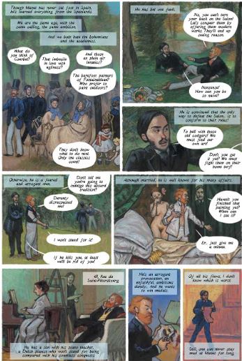 Degas & Cassatt : A Solitary Dance is a graphic novel told from the point of view of Edgar Degas himself, the flow of the text is romantic, artistic and even a bit abstract. We see the life of an artist with contradictions surrounding him, the selfishness and the reasons behind his lifestyle. The arrogance of the Degas oozes off the page, the haughty attitude towards dogs (nothing is worse than a dog, unless it is …. and he rattles off a laundry list of worse things, turning back eventually to dogs). The snobbery of his father (finally allowing his son to pursue being an artist with the stipulation “don’t be a bohemian” and yet, Degas’ path would lead him on a similar path). And that was just the first quarter of the book, and where I stopped reading.