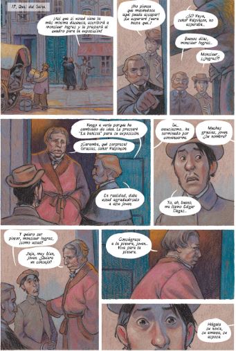 The start of it is what looks like an older woman (perhaps Mary Cassatt, but if there was a clue to her identity, I missed it) speaking of Degas at his death. Author Salva Rubio then goes into the life and times of our male artist. Perhaps more of a “feel of the person and times” than a true biography, a lot is going on in this book. The illustrations have a feeling of the style of the times, the colors and details being not only a supporting character of the text, but also its own character. Plus, you can locate some fun Easter Eggs that find their way to the page, allowing you to glimpse art in a new fashion. This allows for things to have a classical tone and brings you to the era being lived. Many artists will be mentioned such as artists that inspired Degas and ones he immensely disliked. You might need a scorecard to keep track of them! Also, be careful of looking at them and their works (works mentioned) because I found myself going down one wild rabbit hole looking into a few.