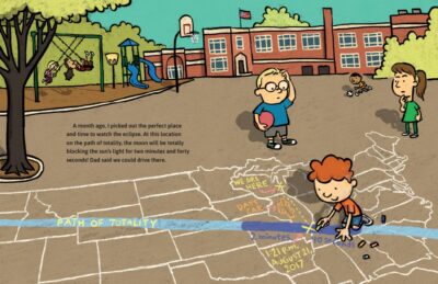 There is back matter about eclipses, a map of when the next ones will happen (most will be in many years, just like the one that was in 2017 that inspired the book). The most clever part was that the child has mentioned that it will be years for the next one (2017 to 2024, but then even more for the next) and the art shows a bit more fun future setting that I almost bet most of us really want to see (really cool “space cars” anyone?)