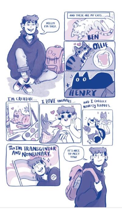 Perhaps the first thing I noticed about Homebody (outside of the “removal of color” and the use of color in a non-traditional fashion) was how open Theo Parish’s story was. They are not giving you the “down and dirty details” (unless you count one of the cats giving themselves a um… down there … bath) but they allow you into their world. We also are not given all the “bad things,” just honesty that they were there. The third was, how they do not use the word cisgender or cis as a “dirty word.” No, I didn’t skip two, that is the actual point of the review.