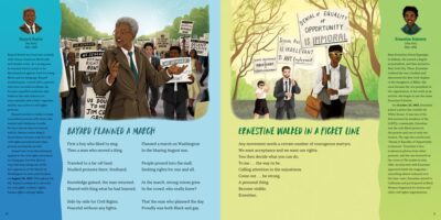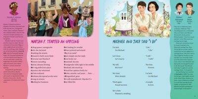 The poems range from all types of styles, but each one highlights someone that was historically influential even in the littlest way. They published a magazine, they got married, they marched in and on Washington, they were drag kings, they started a riot (one was a riot of a drag king), they influenced a king (one of Dr. Martin Luther King advisors). There are rhyming poems as well as straight prose, and we find out which is which at the end where we also have a glossary of terms.
