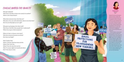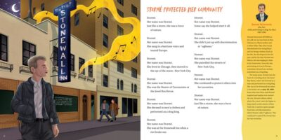 The main book is boldly, colorfully, busily illustrated by Harry Woodgate. These images bring to life each person mentioned. They are both character and supporting character of the subject matter. Each person is given a poem (one to two pages long) and a longer biography highlighting their accomplishments. From drag queens and kings to transgender people to gay men and women, each person comes to life.
