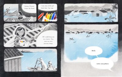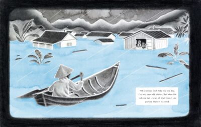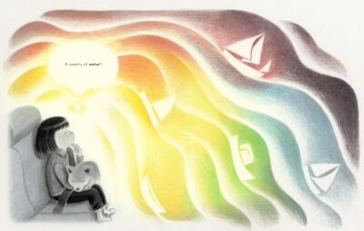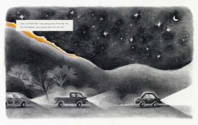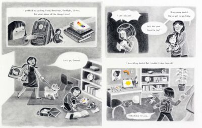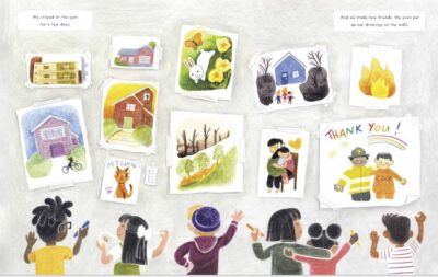 The best part for me was the use of the illustrations to express what is happening. The colors are used to show the feelings, emotions and situations by only allowing color to come into play when it is needed. The orange of the fire, the rainbow on the box of crayons, and then the explosion of color when the community of children at the shelter come together. Everything, even the gray/white and “sad” images, are dreamy, but the color images (especially the more dream settings) are mostly done this way. I took this from the Kirkus review: “Panels in varying shapes and sizes outlined by negative space give the narration a comic book-like structure, and dialogue primarily appears in speech bubbles.” This best tells how Minnie Phan’s illustrations are loveingly done and are as much a story in themselves as the text. Both support each other and are their own characters. The images help counter the more serious aspect of things.