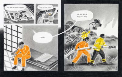 The second best part, and a part that I would have liked to know more about, is the fact there is a second use of the color orange. Orange, of course, is used for the flames, but also another orange is used on the jumpsuits on the men who are fighting the fire. They are not regular firefighters, but have CDCR on them. They are prisoners from the California Department of Corrections and Rehabilitation who have been used to help. I found this part interesting simply because there is a current television show (I tried to watch, but which did not grab my attention), that is based on this concept. Mixing a fiction story with reality is a neat way to show what happened.