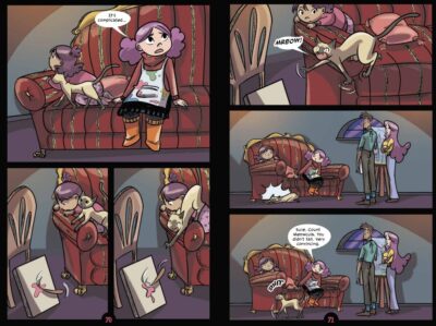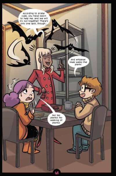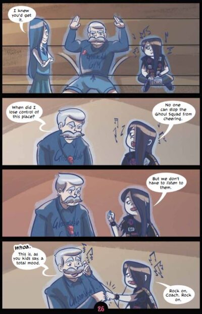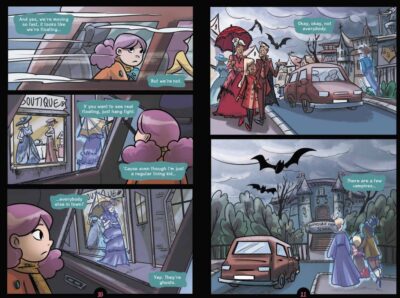 The one thing I have with sequels is that if I read them too far apart, I forget parts of book one/the book(s) before. And that happened with Spirited V02 Go, Ghoul, Go! by Liv Livingston and Glass House Graphics. I mean, I remembered that Liv is the only living person (if you don’t count the werewolves and creatures of the swamp and such, I don’t count vampires) in a school of mostly ghosts. I remembered that she has two good friends, a “mean-girl” in her life and her family is none-the-wiser to the whole “spooky” thing. But there were a few things I had forgotten (like a plot piece that actually plays a stronger role in book two). Nonetheless, I was able to pick things up easily enough and start on volume two with little bumps.