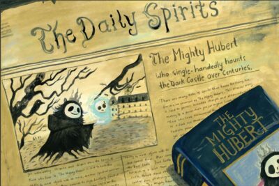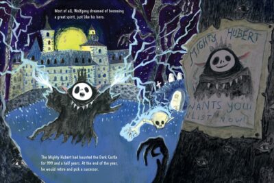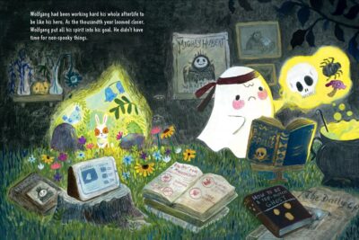 All the wonderful goodness of this story is how the theme of being yourself has been illustrated in a manner that takes the story in a fresh new direction.. The story is cute, but we’ve seen it before. Wolfgang is a ghost who loves spooky things, and has worked very hard to become scary like his idol. But he also likes flowers, stargazing and being with his meadow friends hugging all the trees (even the trees with eyes). So Wolfgang in the Meadow is happy. But when he learns his idol is retiring after 999.5 years haunting the castle, he tries out for the position of successor in that half year that is left before the spook of spooks retires. When he wins (he spins fast, possesses the most ancient creature), things are not as rosy as he thought they would be.
