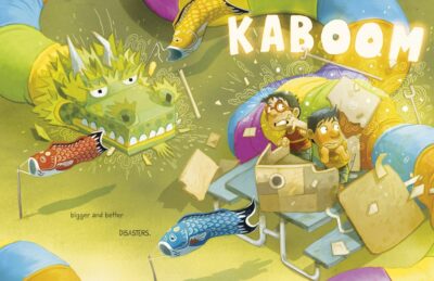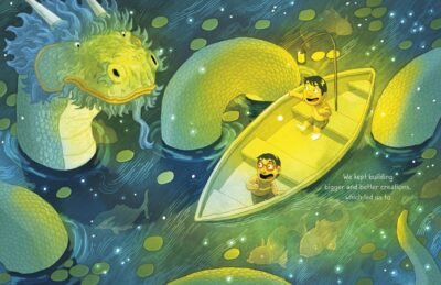 The sweet, fun and colorful illustrations are their own character and support the text as well. They are a mixture of fantasy and realism in Santat’s signature style. When the two best friends are imagining sailing the ocean, being attacked by a dragon, the smoothness of things will then come to be shown as a realistic kite and statue and the “boat” paper and tape. The best part of them is the colors. What is used allows everything to pop off the page.