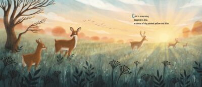 We will see the ocean, forests, and more. We will see all types of animals and a young child and their family, all dealing with the cold. There are also extras included which allow the book to go from a sweet poetic tale to scientific facts all at the same time. It also allows the book to grow with your child. These facts tell about cold, environmental changes, and how you can help. This is a small package that packs a punch. Illustrations are by Ramona Kaulitzki. Their work feels a combination of old school painting and modern technology. The two are colorful, earthy toned images that are simple, but hold a lot of information. You read them as much as the text itself.