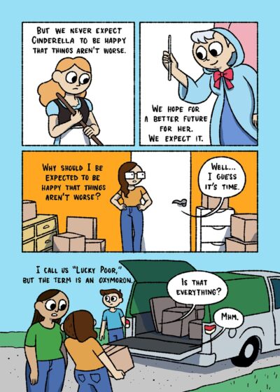 The part I enjoyed was, even though Lovie is reflective of the events that happen to her, she never gets into a “oh sad, poor me! My world is so horrible!” voice, but takes things head on and grows. As she says, if she didn’t have some of/all of the opportunities she did have, where would she be now? She started to realize that her family was, yes, “lucky” and things “could be worse” but what does that really mean?