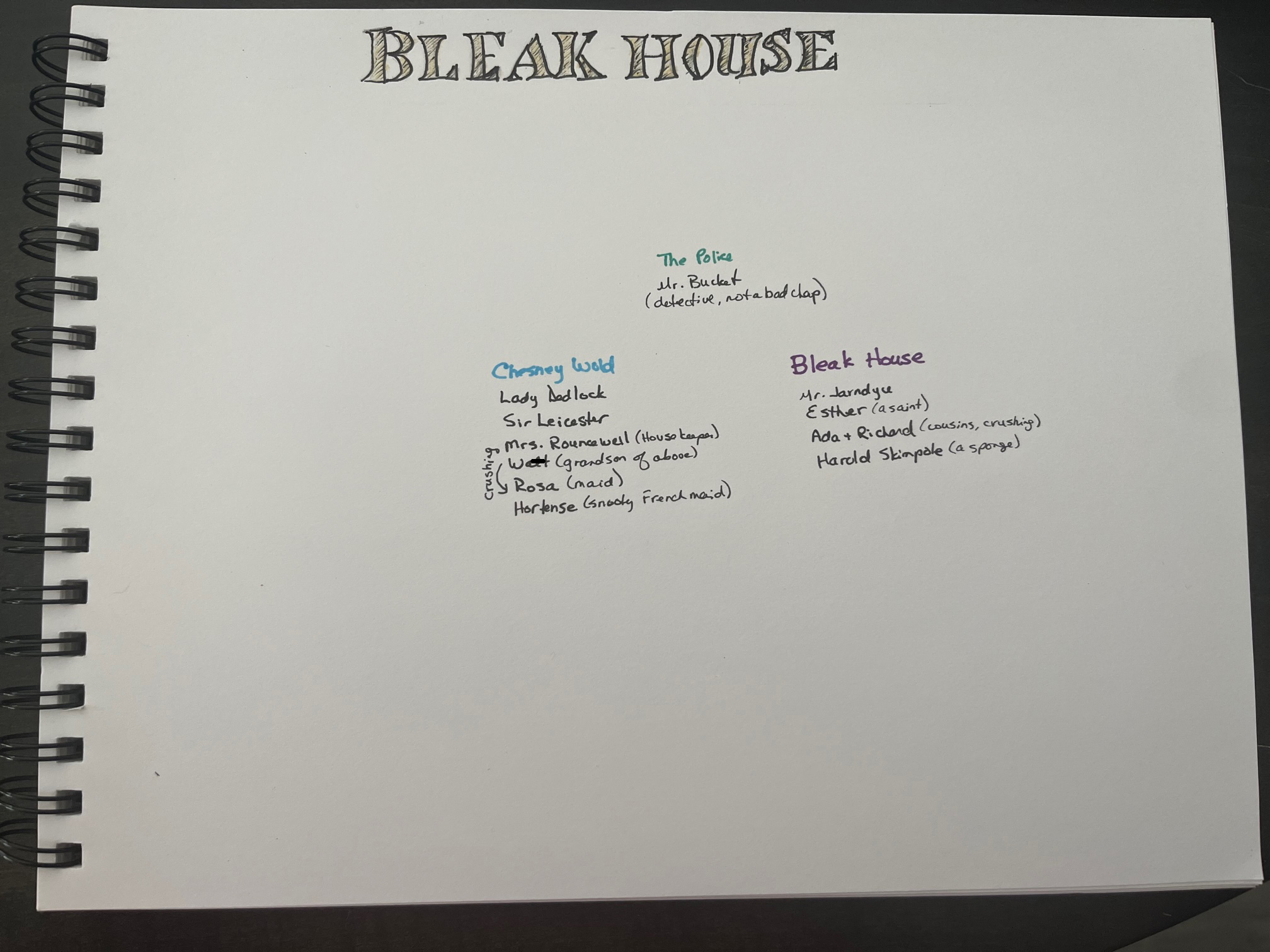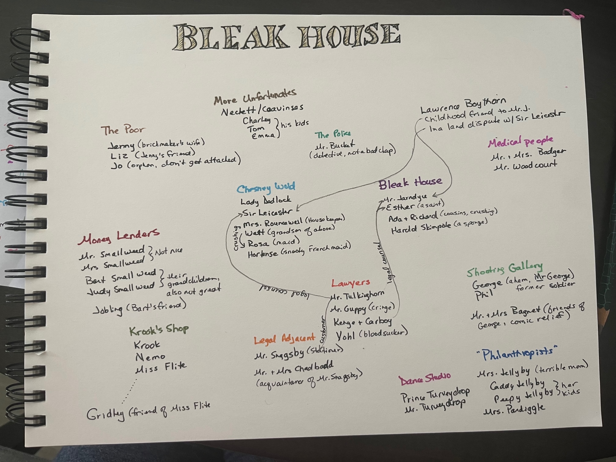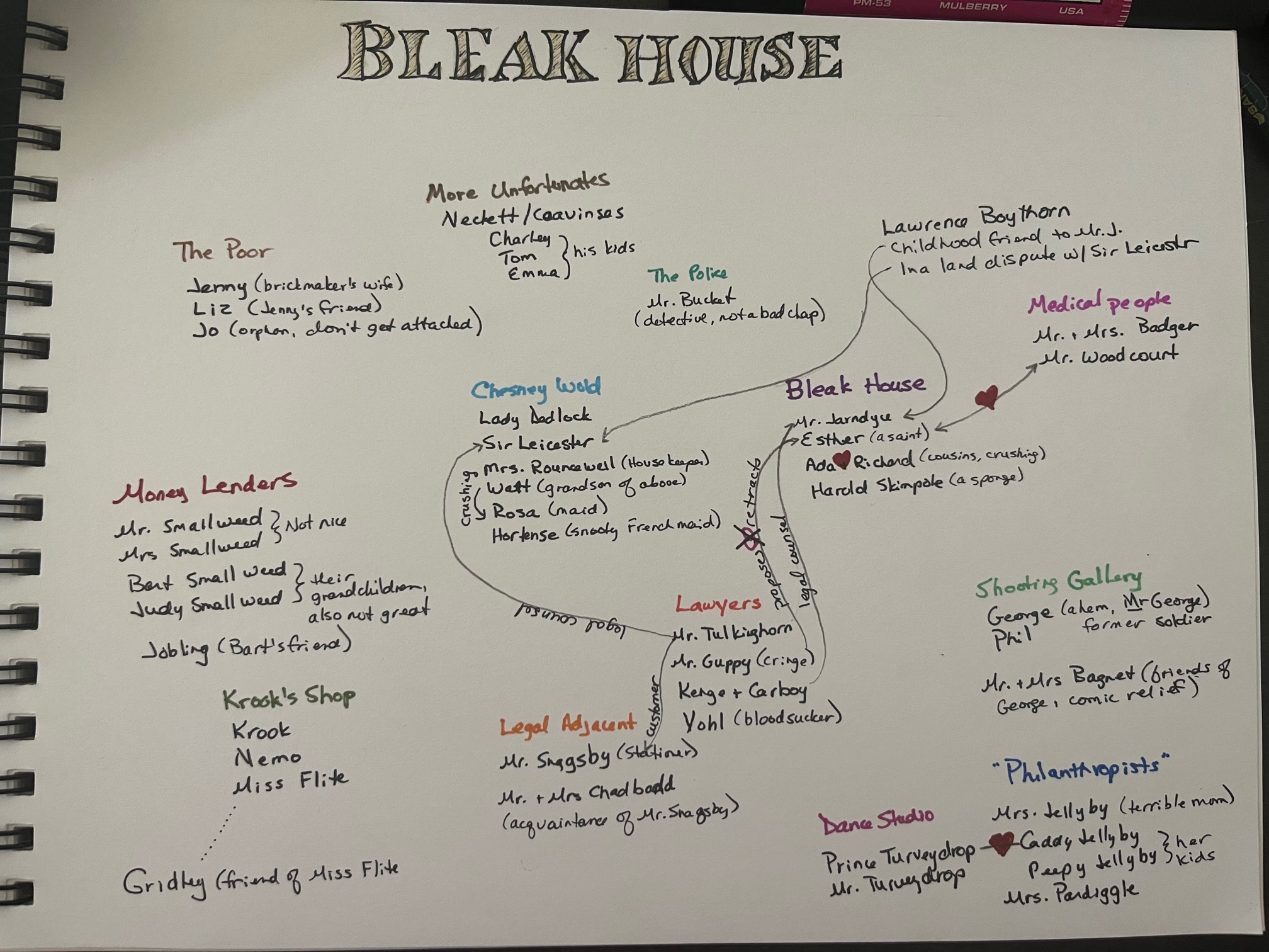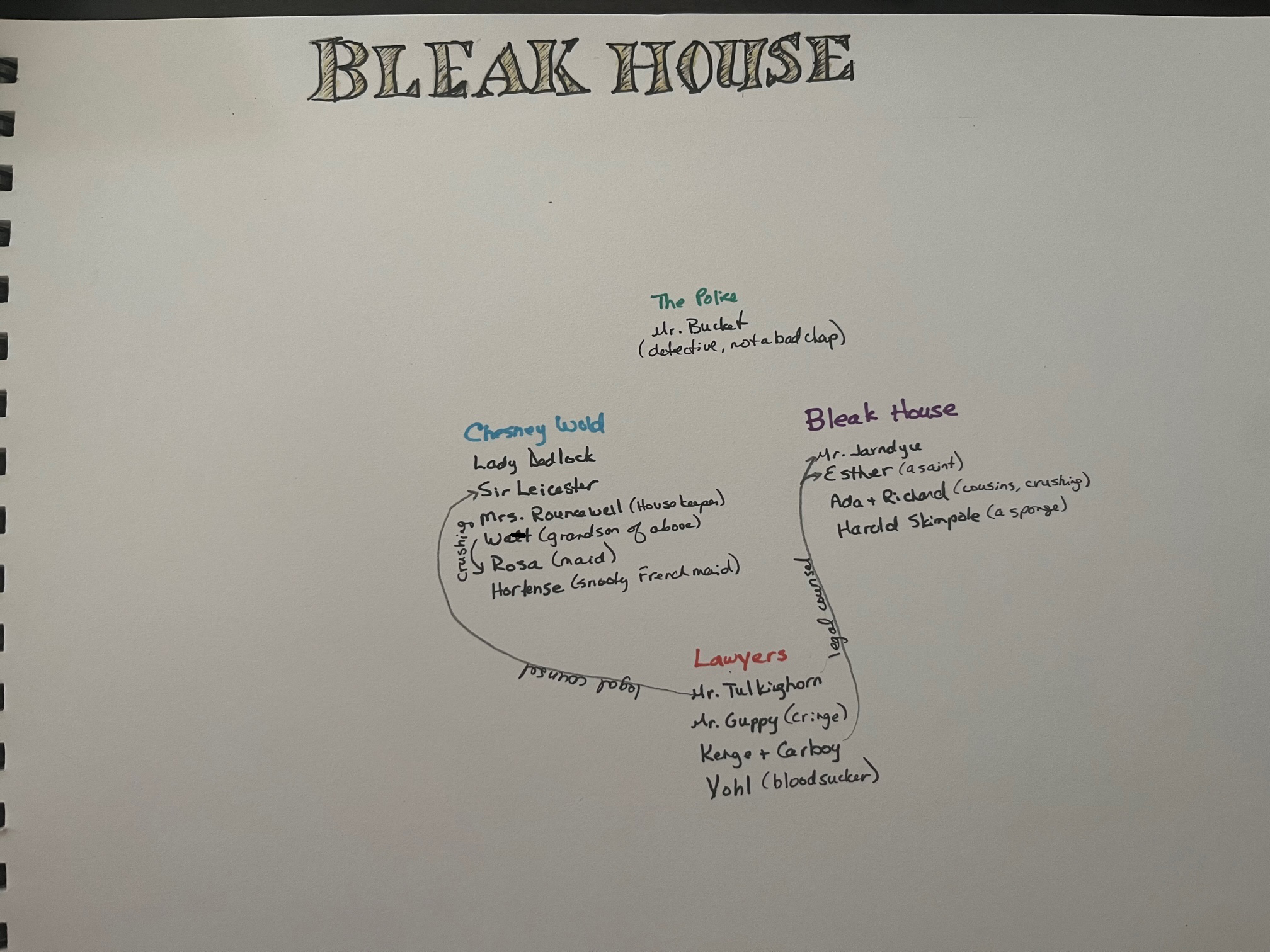While all this is happening, we meet Lady Dedlock (classic Dickens name!), who is also involved with the suit, though somewhat peripherally. She’s married to Sir Leicester, who owns Chesney Wold. You know what, I think we could use a little chart about now to keep track of the characters.