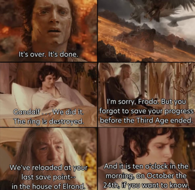 - Gandalf? He’s definitely just bored. He finishes our saga by acknowledging that there are a lot of problems left, and he can definitely help, but he’s not going to. Not for any specific reason. Middle Earth is just not the vibe anymore. His Fourth Age starts with a threeway with Tom and his supernaturally hot wife before going to get faded in the east.