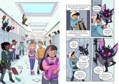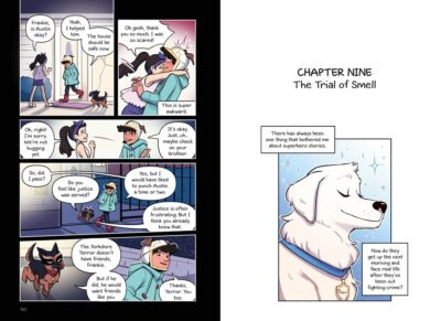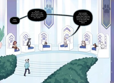 The biggest one is finding where you belong when you learn you are different from the “norm.” In School we have a young girl who finds out she is an alien, and here we have our protagonist realizing their non-binary status and that they have been chosen to be the Dog Knight to help keep the balance of man and dog and good vs. evil. And while School has humor it is darker than The Dog Knight and less realistic (even if there are talking dogs and magical helmets so you can hear said dog, and the dog bone is actually a magical sword). This time we have a cute story about a young kid finding their place at home, in school, and the universe. Their non-binary status is not the main focus, but is good for representation without being pushy. The illustrations are bold, bright, colorful, bubbly, simple (not simplistic) and support things so you can focus on the story, but there are small details that you need to read in the art.