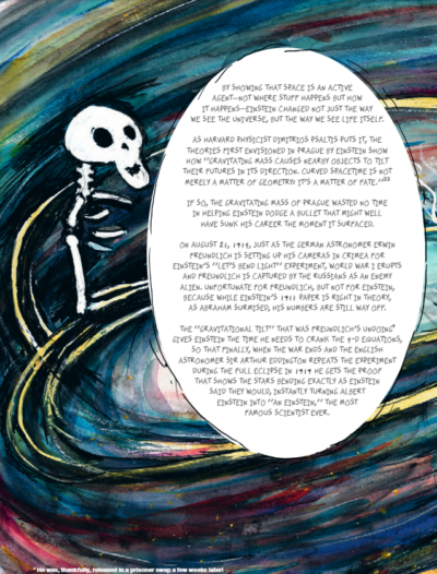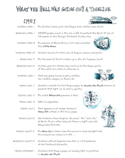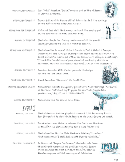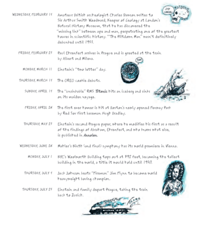 Having only read those 20 pages, I started my review. I had that feeling above. And not even haven finished it, I knew this is going to be a bumpy, screwy ride. After writing that above first paragraph, I went back to the slow trod of things. The first 70-80 or so pages are heavy on Einstein, with a small interlude with Kafka. Things were abstract (there is a whole section of the skeleton talking to Mileva Marić about her and Einstein’s first child, a daughter born out of wedlock, and given up), but mostly real. Yet, don’t get too comfortable, there is more abstract to come. Mostly we see how Einstein was Einstein, how his office overlooked the insane asylum, how he gave his first lecture and so so so much more. And have pen and paper handy. You will meet many famous people along the way.