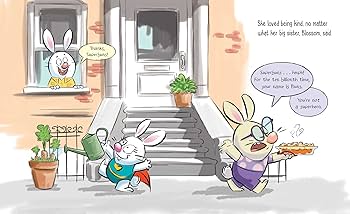 Buns is a bunny who likes helping people in her community. The day she and her sister are taking a gift to someone, Buns seems to be dawdling and goofing off. And because of this, her sister is worried they won’t make it in time and the cobbler they made will get cold. Of course, Buns is just doing what she does best, and not even her bossy, know-it-all big sister can stop her. Which, of course, is a good thing (even if I resent the implications that only younger siblings can be heroes and we big sisters are the “semi-villain”). Because if Buns had listened to her sister, someone who really really needed help would not have gotten it. (And okay, since the big sister plays an important role here, I forgive the above implications.)